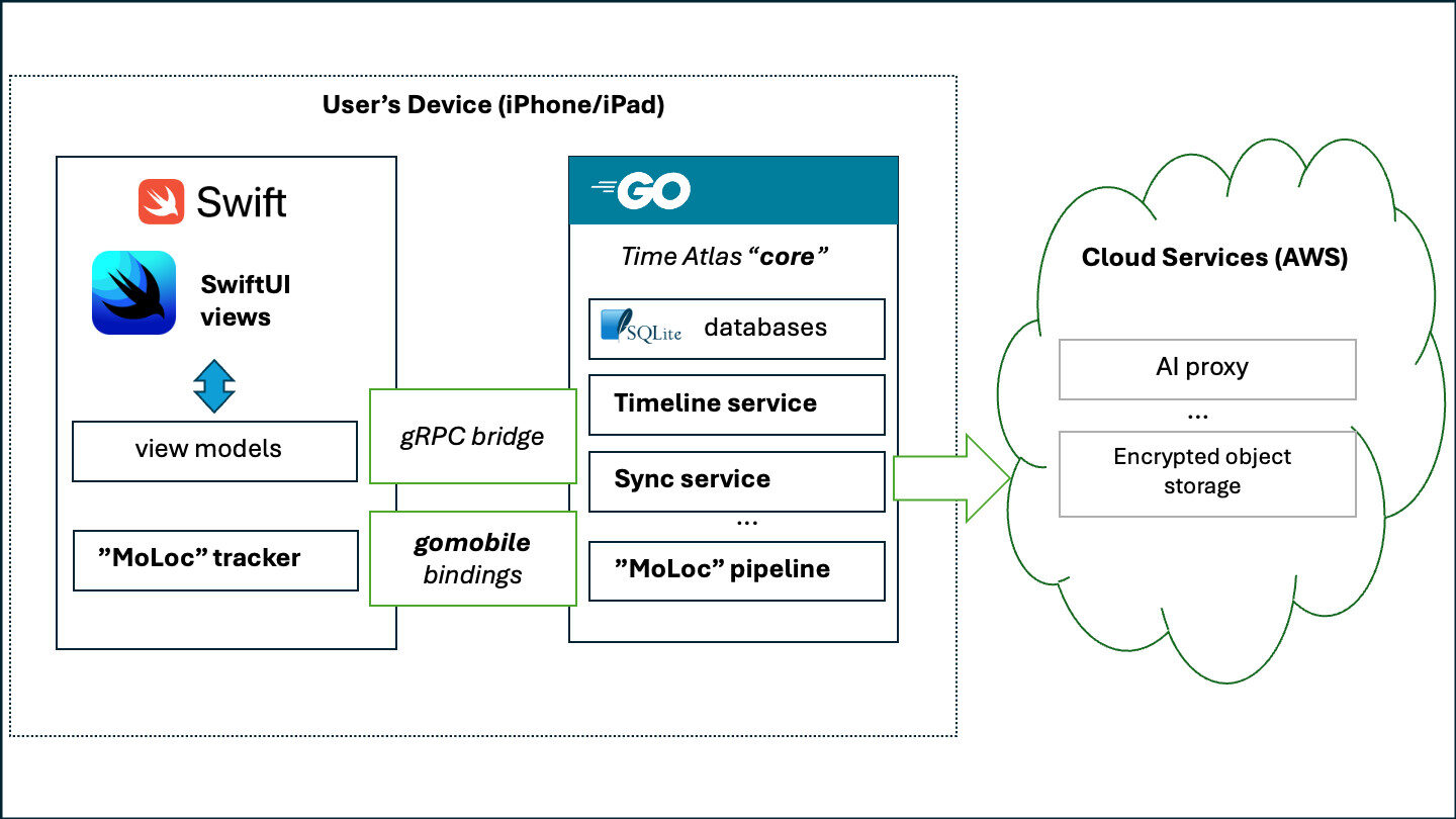 Sync service takes of synchronizing user’s data to the cloud. It is end-to-end encrypted, so only the user’s app is able to read the data. That is, Time Atlas team does not have any access to your data. In addition, in the cloud we have proxies for AI APIs (OpenAI currently, but we have also tested Fireworks), and some other services such as logging and place-of-interest (POI) database.